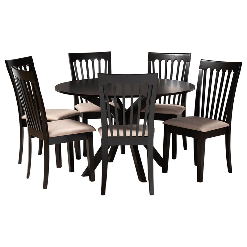 Sleek curves and a rich finish define the Bosvenna dining set. Made in Malaysia, this wooden set includes one table and six chairs, each upholstered in a light fabric that complements the dark brown wood finish. Designed for both comfort and style, each chair features a plush foam-padded seat, as well as an exquisite cut-out design on its back. The round tabletop is supported by splayed legs that form a unique sculptural base, creating a chic profile from any angle. Requiring assembly, the Bosvenna dining set is well suited for both casual and formal dining.