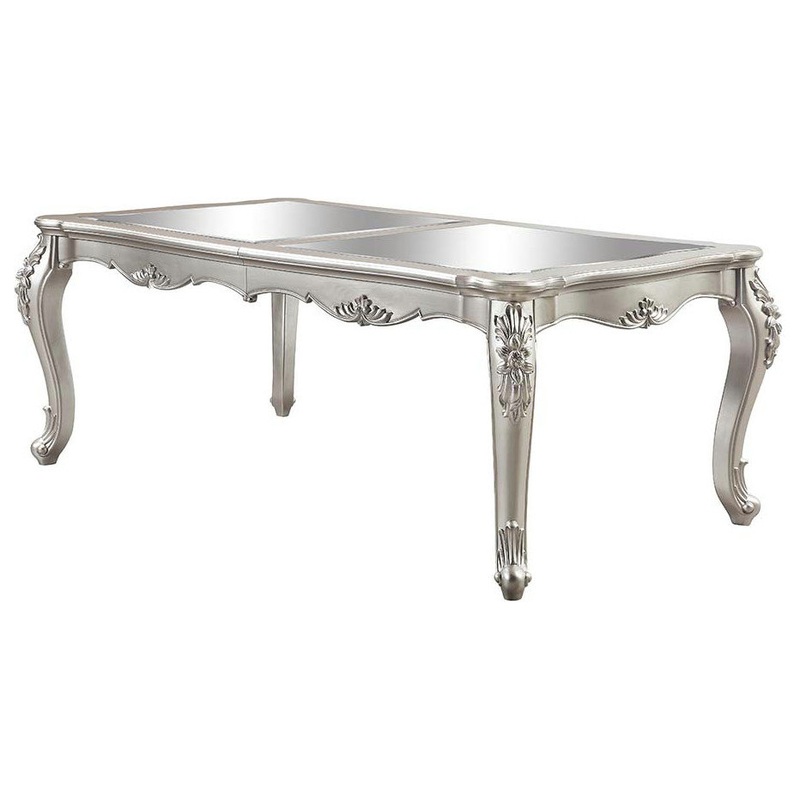 An ode to traditional glamour, the Devayne dining table brings in all the allure and charm that you are seeking for a dining table. The table features an extension leaf that allows for additional dinner guests. The champagne finish enhances the beautiful floral moldings on the legs and apron. The tabletop features mirrored panels that highlight your dinnerware.