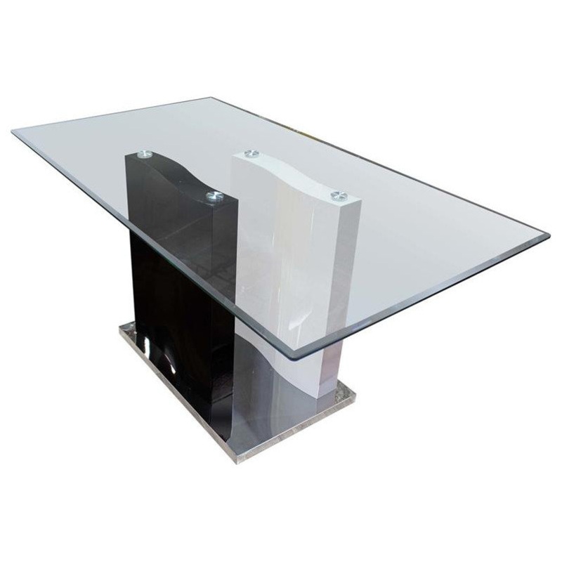 This dining table has a rectangular shape glass top with a black and white base. The stainless steel base will keep this table steady and strong. It is made of poplar wood, stainless steel base and covered in shiny high gloss. Table can fit up to 6 chairs