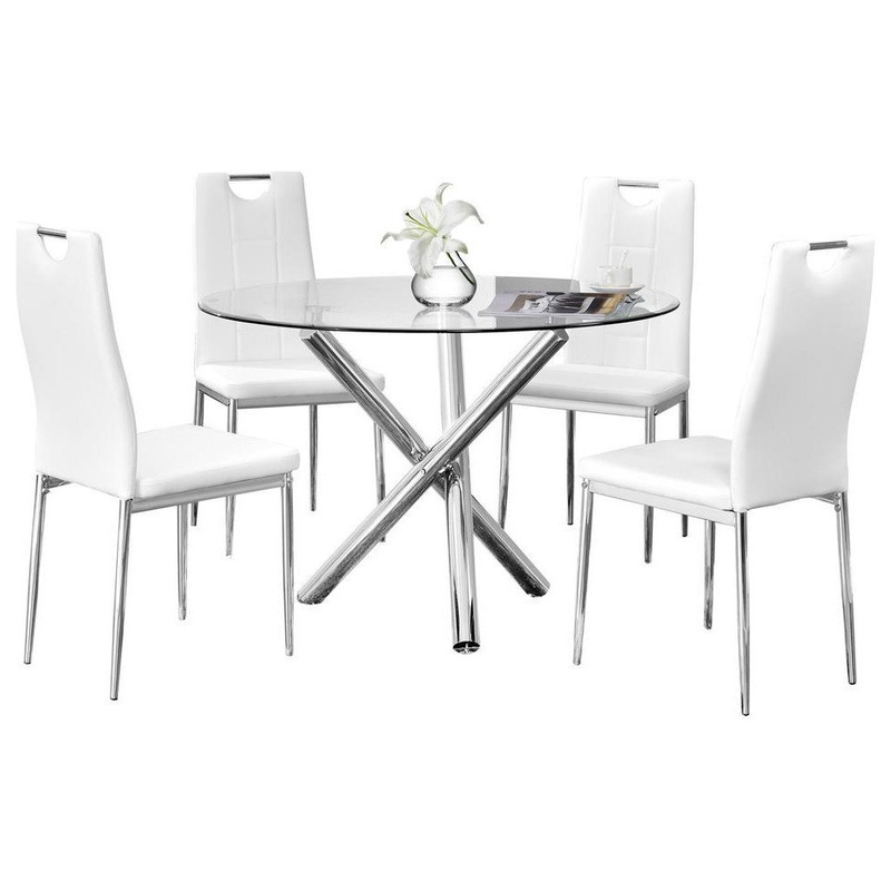 -This is our contemporary and glam set that can transform your dining or kitchen to another level. -Color: White -Material: Glass, Chrome, Faux LeatherProduct ID159230142Manufactured ByBest Master FurnitureSold ByBison CommerceSize/WeightW 46" / D 46" / H