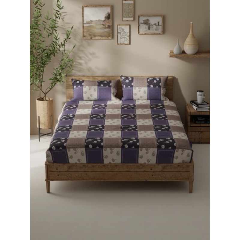 Bianca Lacasita Purple Cotton Checks 116 TC Double Flat Bedsheet with 2 Pillow Covers