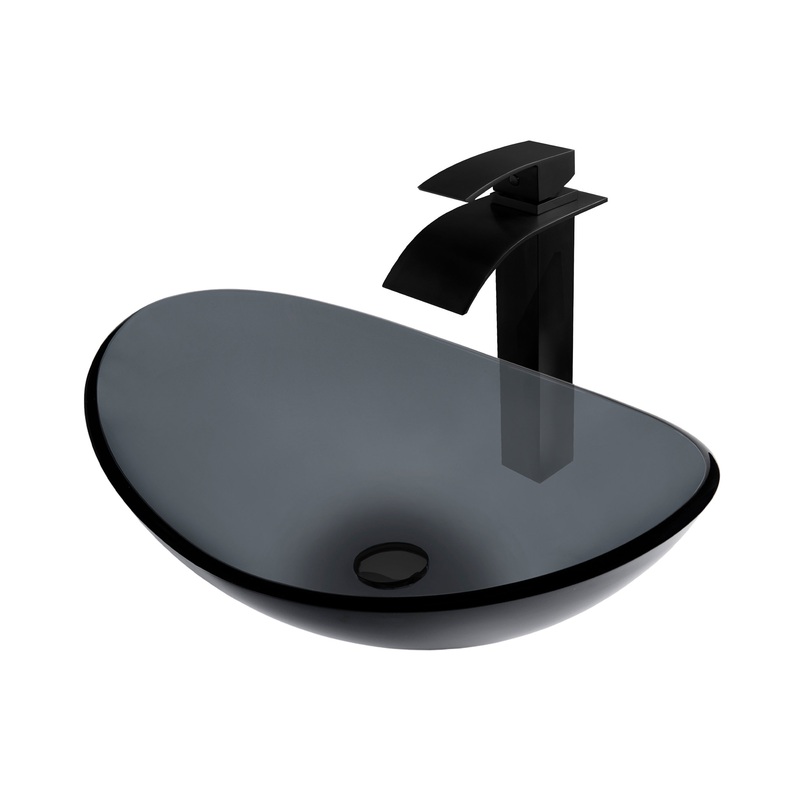 Create your bathroom oasis with Novatto's Bigio vessel and Eclipse waterfall faucet. Glass vessel sinks can be used either in a powder room as a focal point or in a master bedroom for everyday use. This clear slate grey vessel sink will complement most dec