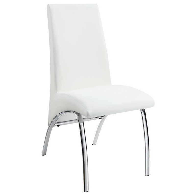 Veer off in an ultra-modern direction with this exquisite contemporary dining chair. From the Ophelia collection, this side chair is a stunning addition to a glass-topped table (sold separately). Smooth and sleek white leatherette upholstery delivers a clean, precise aesthetic. Curvy chrome finish legs are thin and trace the contours of a dramatic seat shape. Relax over a luxurious dinner without compromising on style.