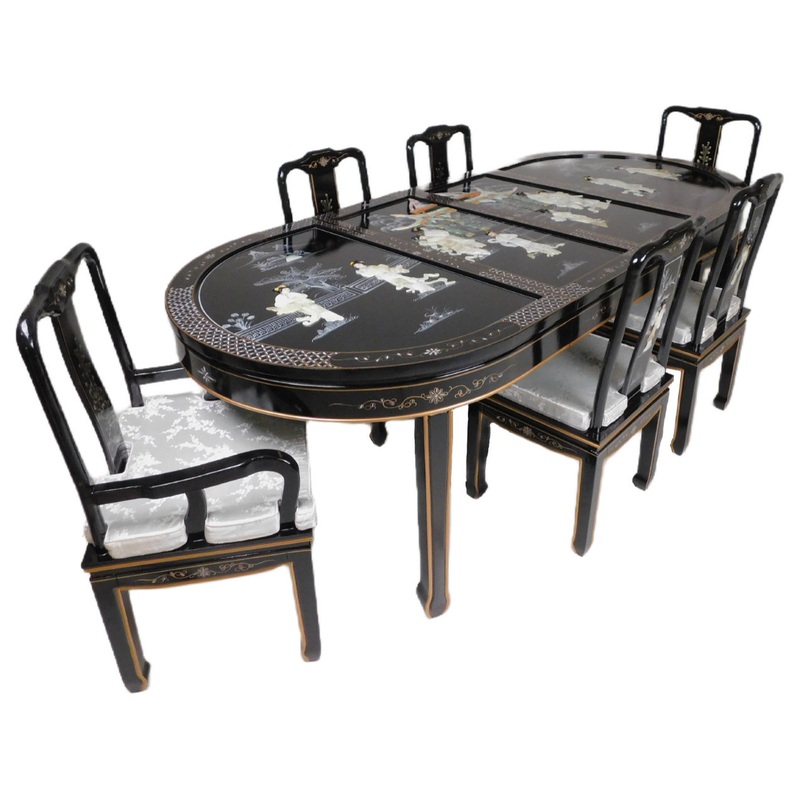 This stunning 96 inch Oriental dining table set includes 6 chairs, two extension leaves, silk cushions and glass tops to perfectly compliment your dining room. The black lacquer Oriental dining table is hand painted and inlaid with luxurious mother of pear