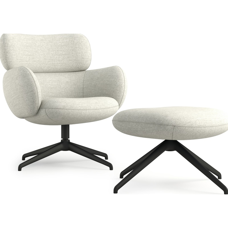Designed by Belgian design house Beaverhausen exclusively for DWR, the sublime Blis Swivel Chair and Ottoman (2025) have a unique personality. Bringing softness into any space, this chair welcomes you with its rounded silhouette and smooth swivel base, whi