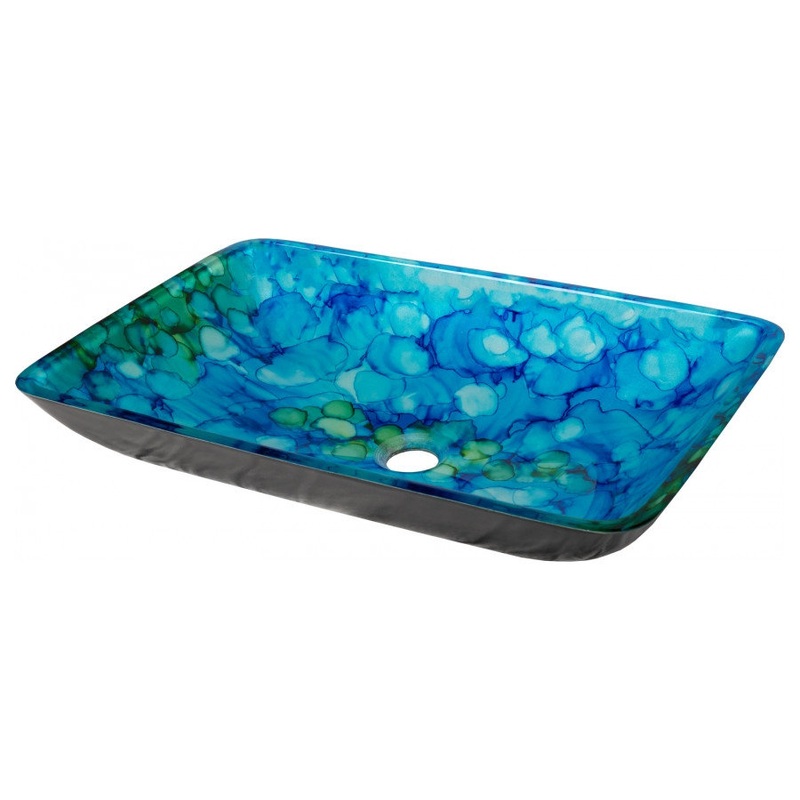 The Eden Bath Blue and Green Water Lilies Above Counter Rectangular Tempered Glass Vessel Sink features a rectangular shape that gently slopes upward with rounded corners. It has a solid black exterior, which strikingly contracts with the and blue and green drops of varying sizes, shapes and shades, reminiscent of a water lilies painting. It would be a lovely burst of color for a guest or master bath. The sink interior and exterior are both smooth. This sink has a flat top rim so it could also be under mounted and it it could also be semi-recessed in additional to vessel mounting. Each glass vessel sink is made of high quality tempered glass. We recommend that you also purchase a mounting ring and drain with your glass bathroom sink bowl in the same finish of your faucet.
