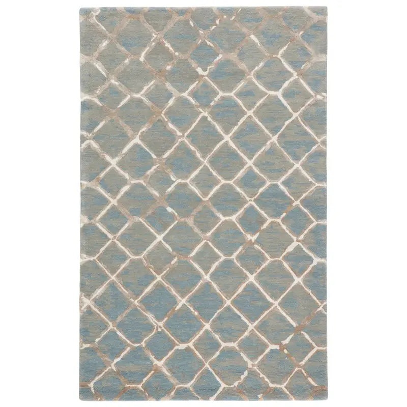 This rug reinterprets Moroccan elegance with contemporary flair, featuring a captivating lattice design in a serene palette of blue and off-white. Hand-tufted from a luxurious wool-viscose blend, the piece balances organic texture with a subtle luminous sh