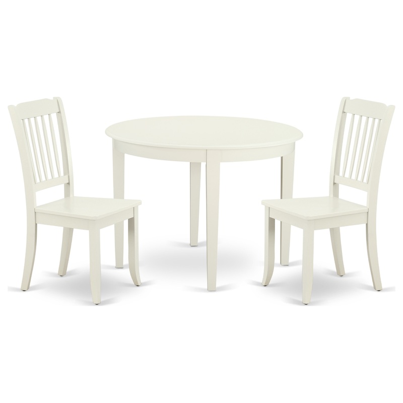 The BODA3-LWH-W Kitchen set provides a distinct, sleek Linen White finish well-fitted to any sort of home decoration style. The fresh and clean lines dominate the cutting-edge design of the round kitchen dinette table. This small dining table require a very less space and it’d be a great choice if you are struggling with the issue of space in your house. This small kitchen set provides you with subtle and cleanly made dining chairs made from solid wood with a matching Linen White finish. The eye-catching Danbury dining room chair finished in elegant Buttermilk and Cherry offers a modern look in your dinette space. The Kitchen dining chairs come with a solid wood seat to fit personal preference and perfect design. The Stylish dining chair features curved front legs. The 7 vertical slats give any dining area a touch of class and sophistication. Made up of hardwood, the chair is stable and offers a sturdy finish. The chairs add elegance and class to any place you have placed them. The frame of the chairs are engineered to offer a great amount of comfort to your spine and thus reduce the chances of back pain. The matching color of the chair with the table brings a good contrast in the kitchen area. The standard shape, size and design makes the dining area significantly attractive. This contemporary, budget friendly, durable and comfortable dining set can be good choice if you are looking for a great dining time experience with your family or friends.