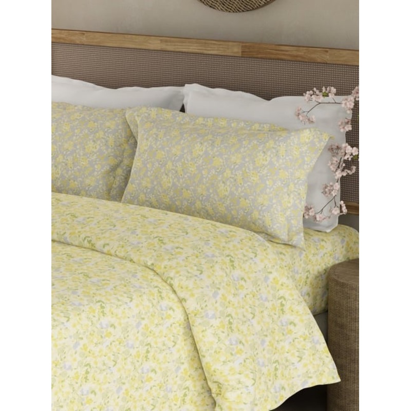 Boutique Living Valatia Yellow Cotton Floral 200 TC Double Flat Bedsheet with 2 Pillow Covers