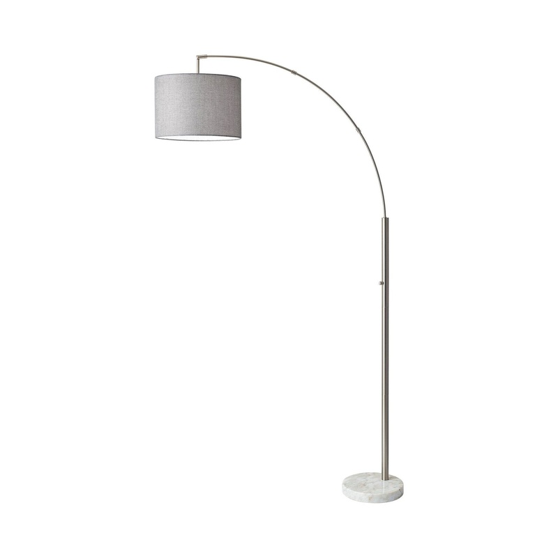 A smart and stylish way to light up a seating area, the Bowery Arc Lamp provides overhead lighting that can be controlled with an adjustable shade. Aside from functional assets, an brushed steel finish is paired with a white marble base to display striking style. An 100 Watt bulb shines beautifully through a grey tweed-like fabric shade. An on/off rotary switch is placed conveniently on the pole. This lamp has a clear cord and is smart outlet compatible. Bulbs are not included.