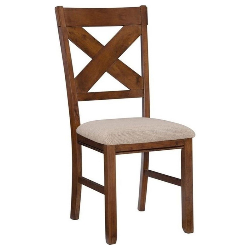 The Bowery Hill Dining Side Chair is a great addition to the Bowery Hill Dining Table. Featuring an X-styled back and plush 100% polyester upholstered tan seats, the frame is finished in a Dark Hazelnut. Some assembly required. Purchase includes two chairs