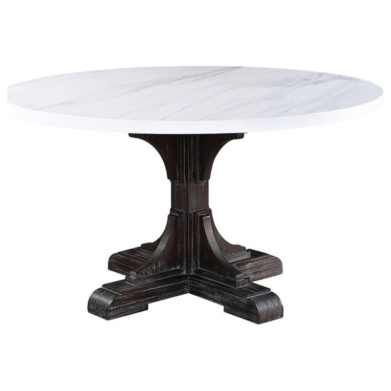 Warm wood tone paired with elegant white marble brings classic beauty into any ordinary space. The Bowery Hill Dining is founded atop wooden pedestal base in a weathered espresso finish, which showcases elaborate carving details on the base. White artificial marble top in a soft round shape design adds beautiful richness and depth to the table. Both practical and visually alluring, the dining table will instantly elevate the entire space.