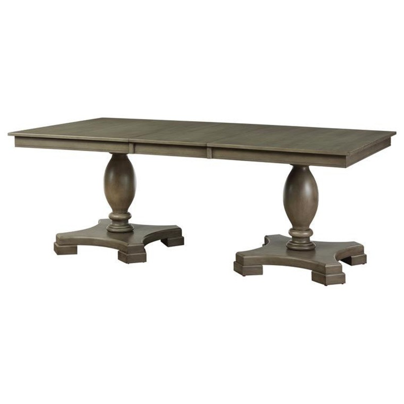 Conscious of both floor space and dining space, this Bowery Hill Dining Table with Double Pedestal is the perfect fit for your dining room or open kitchen and dining area. Its generous rectangular wood tabletop allows for comfortable seating around the table and is expandable to fit more with the use of a removable leaf. A double pedestal base offers stability and its turned style adds a visual boost.