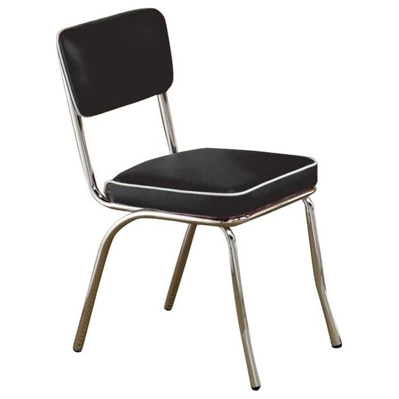 With distinctive styling and classic appeal, this vintage-inspired chair completes your dining ensemble in style. Its rear legs are gracefully curved for sturdy support, while its front legs are more subdued with a subtle, tapered design. With a shining chrome frame, this chair lends vintage inspiration to enhance any dining experience. Its comfy cushion is available in two gorgeous shades. You can choose vibrant red to punch up your decor with a splash of color, or opt for a more subtle black cushion for simple, subdued comfort.