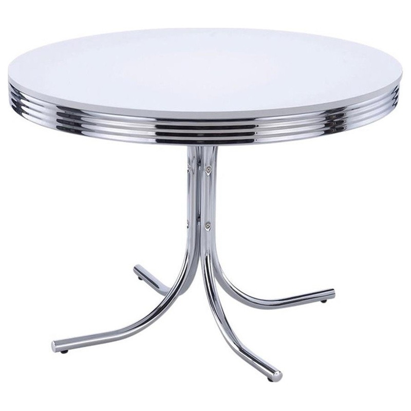 Retro style is back with this round dining table. Table rim and legs are chrome plated, perfect for a room with retro feel. Legs curve out into a base that’s distinctively styled. This table is at home with juice and scrambled eggs as it is with poker and chips. This Bowery Hill Modern Metal Round Dining Table in White and Chrome will be a undoubtedly a great addition to your home dcor. Add a touch of elegance to your home setting. The modern design showcases for a timeless aesthetic that goes with a wide range of decor themes. It has a simplicity and a flare all at once, as if inspired by the simple gown that is confident in taking up its space.