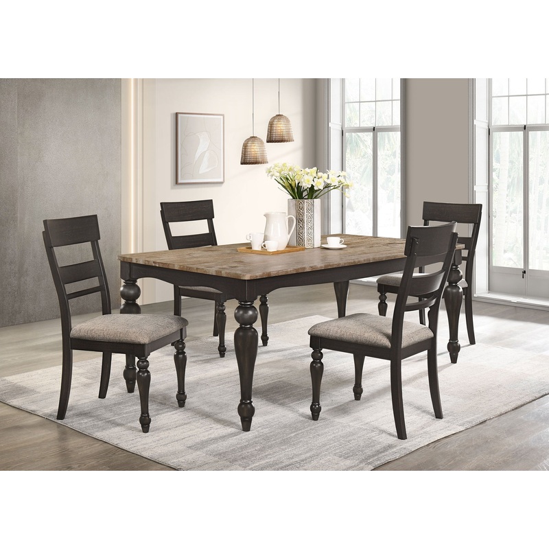 Traditional attitude is bold and rustic with modern updates adding style to your dining area. This five-piece dining set brings out the best in a hybrid aesthetic of farmhouse and mid-century looks with a soft, versatile color and finish palette and construction of Asian hardwoods and wood products. A rectangular table mixes finishes between its brown brushed finish top and a glam charcoal sand through finish base and legs. Curvy lines and turned legs add an alluring feel to a table playing host to brown finish ladderback chairs. A smoothly arched side silhouette with turned front legs creates a glam look, embellished with neutral and soft stone brown fabric seat upholstery.