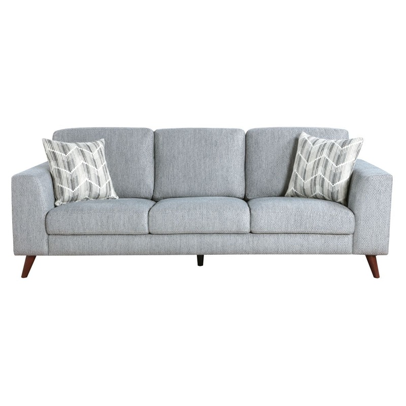 Add a touch of mid-century modern charm and versatile comfort to your living space with this striking sofa. Featuring reversible back cushions and 2 decorative pillows, you can easily switch up the look and feel of your seating arrangement. The soft, textured fabric upholstery complements a variety of dcor styles, while the faux wood brown finish legs provide a warm and stylish foundation. Two decorative pillows add a touch of pattern and comfort. The clean lines and tapered legs embody the timeless aesthetic of mid-century design, making this sofa a perfect addition to any living room, family room, or entertainment area. Enjoy the perfect blend of style, comfort, and functionality with this contemporary sofa.