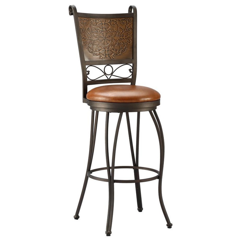 The intricate details on this bar stool make it a unique and eye-catching piece. Finished in bronze and accented with a muted copper, the curved legs and stamped back provide interest to a somewhat simple design. The seat is covered in a rich brown PVC and has a height of 28. Some assembly required.