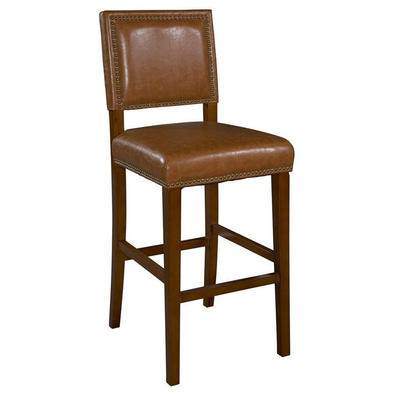 Create a contemporary or classical look in your kitchen, dining or home pub area with the sleek shape and style of this medium walnut finish 24 Brook Counter Stool. Solid wood legs give this courtly stool additional strength ensuring years of everyday use. The padded cushion and seat back provides optimum comfort for you and your guests and is topped with durable caramel colored vinyl that is stain resistant, fade resistant and features tightly woven threads that won’t break, mat or peel. Classic nail head trim accents the stools lines. 275 pound weight limit.