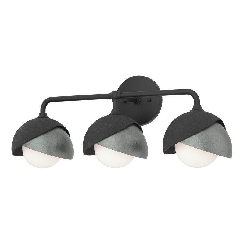 With an overarching curved arm, this Brooklyn wall mount features three 2-shaded glass globes. Shades are available in a two-tone option with a choice of accent color for a contrasting finish, if desired. Forged in 1800 fire, the shades are handcrafted and
