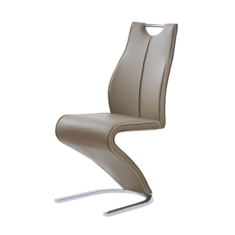 Modern design aesthetic, this dining chair will bring life to your home. Finished in a brown PU with Cappuccino trim and stainless steel base. Let this chair speak for itself!