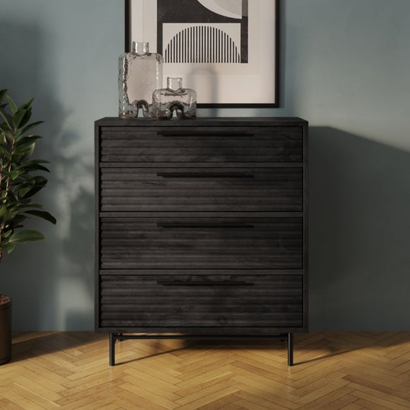 Dunelm Exclusive - Designed and Developed by DunelmMango wood effect4 drawers with ribbed front detailBlack metal handlesMetal legsStore your most treasured possessions with our beautiful Chest of Drawers! Featuring a stunning mango wood effect and 4 drawe