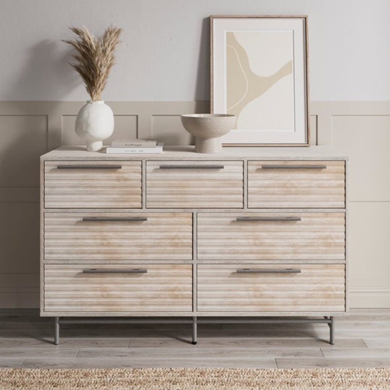 Dunelm Exclusive - Designed and Developed by DunelmMango wood effect7 drawers with ribbed front detailBlack metal handlesMetal legsStore your most treasured possessions with our beautiful Chest of Drawers! Featuring a stunning mango wood effect and 7 drawe