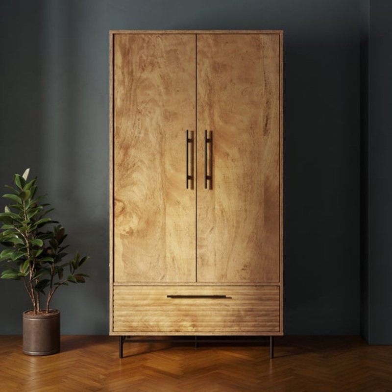 Step into a world of refined organization with our stunning double wardrobe, a true masterpiece that effortlessly combines form and function. With its two gracefully designed doors, this wardrobe exudes timeless charm and sophistication, elevating the aesthetics of any room it graces. The textured drawer front adds a delightful touch of modernity to its two spacious drawers, ensuring a delightful visual contrast. Inside, you’ll find two thoughtfully placed hanging rails, generously accommodating your treasured clothing collection. The stunning mango wood effect finish adds a warm and inviting touch to the textured drawer front, creating a delightful fusion of contemporary and rustic aesthetics. The wardrobe’s exquisite craftsmanship ensures durability and style, making it a seamless addition to your home for years to come.