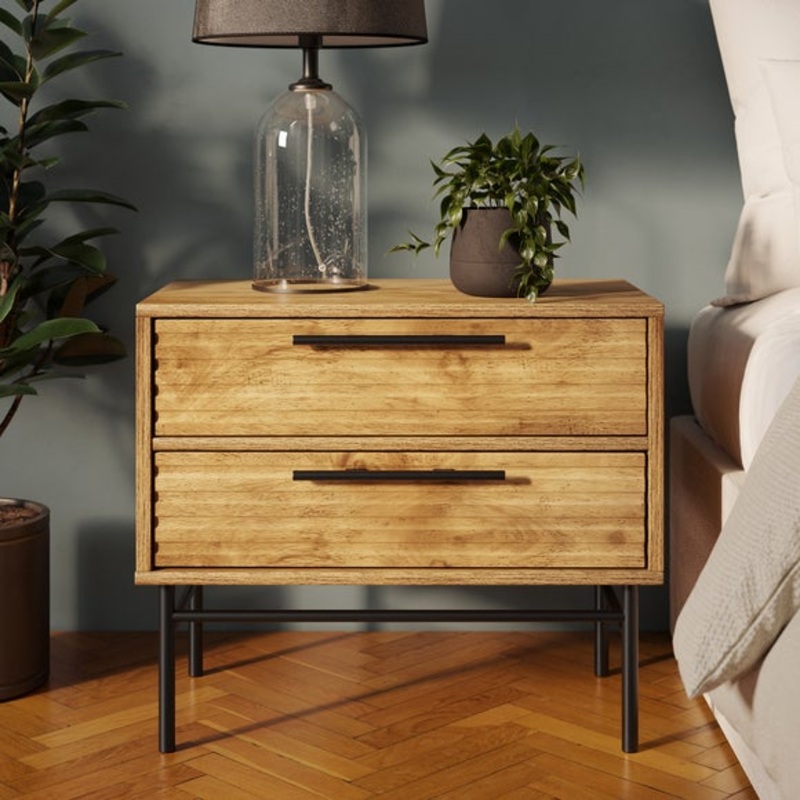 Wide frameRibbed drawer frontsBlack metal handlesThis table is a practical and stylish solution for those needing extra bedside storage. Its wide design and two generously sized drawers provide plenty of room for your essentials, from books and chargers to