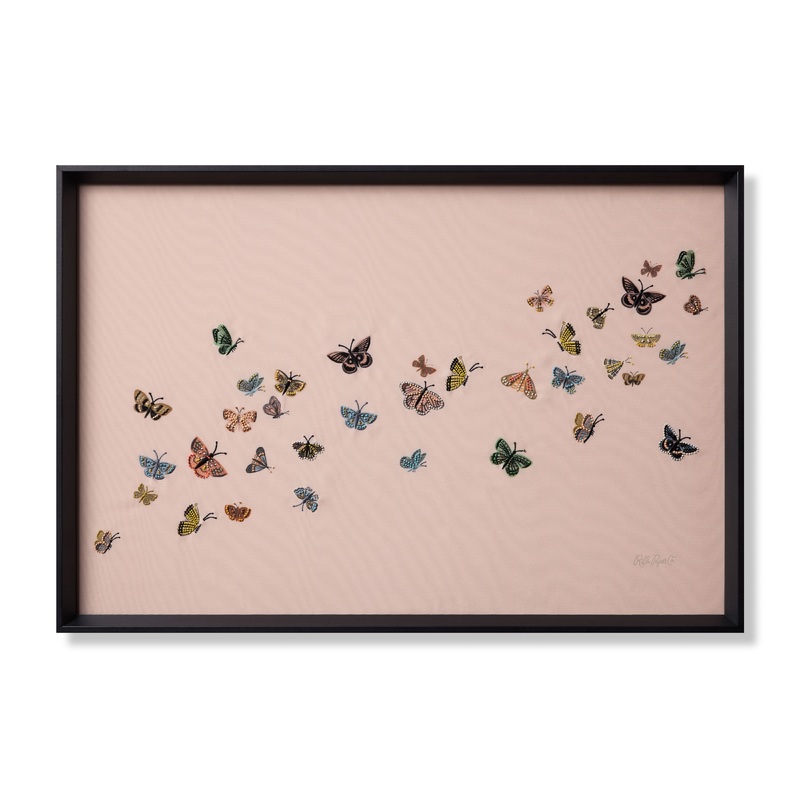 This ready-to-hang Butterflies wall art from Rifle Paper Co. x Loloi features a kaleidoscope of butterflies in flight with delicate embroidered details for artful home decor. The artwork is made in India and custom framed by Loloi in the USA, measuring 25 x 37.