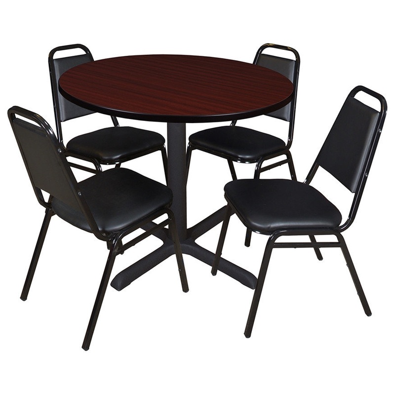 Whether you’re planning a lounge, caf, library, breakroom or restaurant, let the Cain Collection take you there. These versatile tables are at home in stylish caf or coffee shop settings as well as lunch rooms. This set includes one 36-inch round Cain table and four Restaurant Stack Chairs. The table is constructed of a thermal fused melamine Mahogany laminate tabletop that is 1-inch thick and finished with a black T-Mold edge band. Laminates are scratch, stain and scald resistant and wipe clean easily. The stylish X-Base is constructed of a tubular steel post and solid steel X-Base. Hidden adjustable glides keep the tabletop level and are easy to adjust. Inspired by the classic black caf look, the Restaurant Stack Chair is designed for use in almost any setting. The water-repellent vinyl seat and back easily wipe clean with a damp cloth. Reinforced cross-bracing on the black metal frame make this versatile stack chair suitable for every day wear and tear. It can easily be stored away in stacks of 12. All Regency chairs are backed by a 5-year limited manufacturer’s warranty on chair bases and frames and a 2-year limited manufacturer’s warranty on chair mechanisms and upholstery. Cain tables are backed by a 10-Year Limited Manufacturer’s Warranty.
