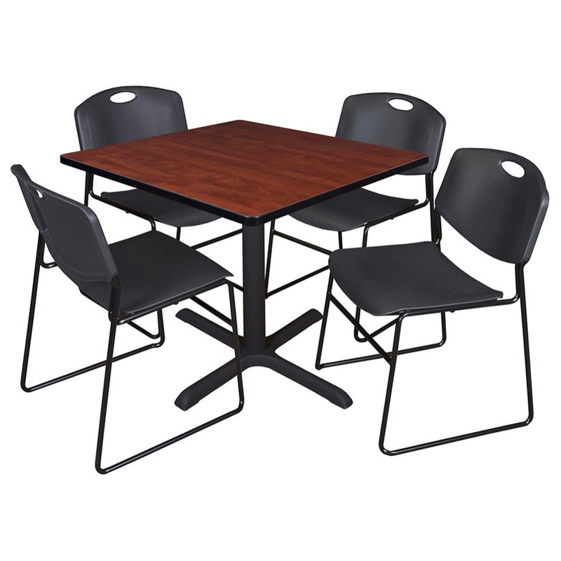 Whether you’re planning a lounge, caf, library, breakroom or restaurant, let the Cain Collection take you there. These versatile tables are at home in stylish caf or coffee shop settings as well as lunch rooms. This set includes one 36-inch square Cain table and four Black Zeng Stack Chairs. The table is constructed of a thermal fused melamine Cherry laminate tabletop that is 1-inch thick and finished with a black T-Mold edge band. Rounded corners make the table safer for everyone. Laminates are scratch, stain and scald resistant and wipe clean easily. The stylish X-Base is constructed of a tubular steel post and solid steel X-Base. Hidden adjustable glides keep the tabletop level and are easy to adjust. Regency’s Patent-Pending Zeng stack chair is not only unique, but durable, sturdy and versatile as well. The Zeng seat and back are treated with an anti-microbial agent, which makes it perfect for schools, waiting rooms, cafeterias and more. A reinforced black metal frame is designed to support up to 400lbs and a built in handle makes moving the chair easier. All Regency chairs are backed by a 5-year limited manufacturer’s warranty on chair bases and frames and a 2-year limited manufacturer’s warranty on chair mechanisms and upholstery. Cain tables are backed by a 10-Year Limited Manufacturer’s Warranty.