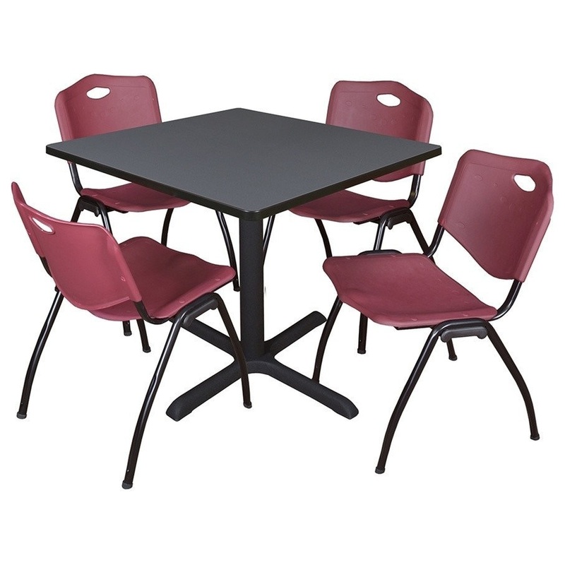 -Versatile table & chair set includes one 36-inch square Cain table and 4 Burgundy “M” Stack Chairs