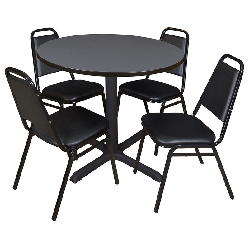 Whether you’re planning a lounge, caf, library, breakroom or restaurant, let the Cain Collection take you there. These versatile tables are at home in stylish caf or coffee shop settings as well as lunch rooms. This set includes one 42-inch round Cain table and four Restaurant Stack Chairs. The table is constructed of a thermal fused melamine Grey laminate tabletop that is 1-inch thick and finished with a black T-Mold edge band. Laminates are scratch, stain and scald resistant and wipe clean easily. The stylish X-Base is constructed of a tubular steel post and solid steel X-Base. Hidden adjustable glides keep the tabletop level and are easy to adjust. Inspired by the classic black caf look, the Restaurant Stack Chair is designed for use in almost any setting. The water-repellent vinyl seat and back easily wipe clean with a damp cloth. Reinforced cross-bracing on the black metal frame make this versatile stack chair suitable for every day wear and tear. It can easily be stored away in stacks of 12. All Regency chairs are backed by a 5-year limited manufacturer’s warranty on chair bases and frames and a 2-year limited manufacturer’s warranty on chair mechanisms and upholstery. Cain tables are backed by a 10-Year Limited Manufacturer’s Warranty.