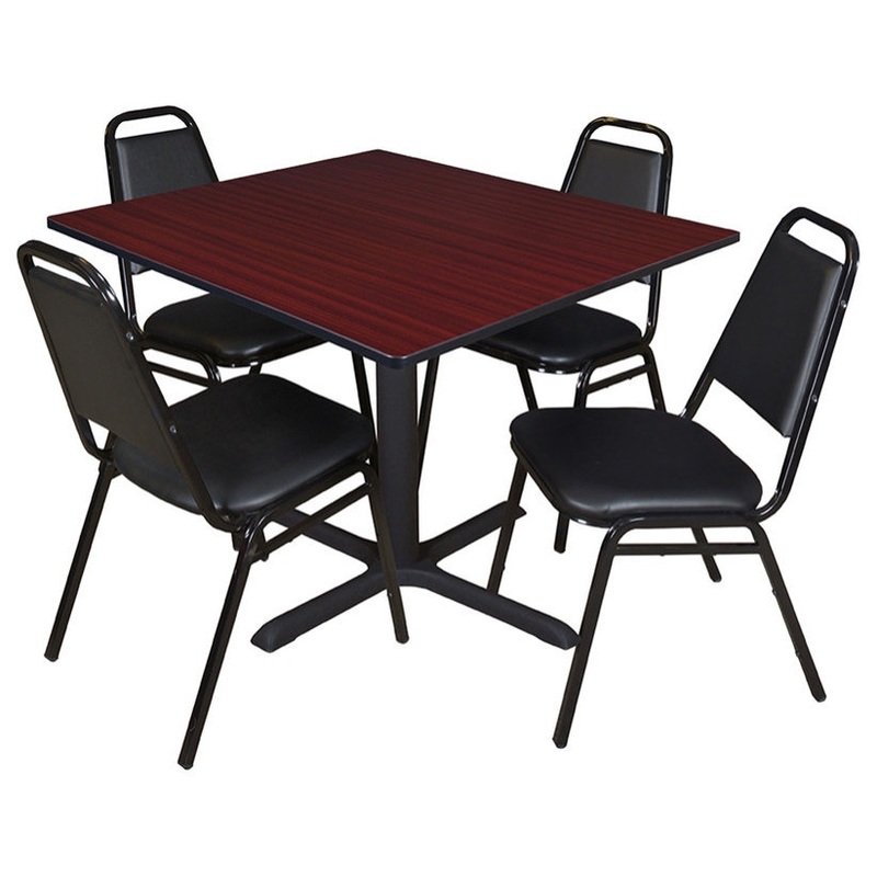Whether you’re planning a lounge, caf, library, breakroom or restaurant, let the Cain Collection take you there. These versatile tables are at home in stylish caf or coffee shop settings as well as lunch rooms. This set includes one 48-inch square Cain table and four Restaurant Stack Chairs. The table is constructed of a thermal fused melamine Mahogany laminate tabletop that is 1-inch thick and finished with a black T-Mold edge band. Rounded corners make the table safer for everyone. Laminates are scratch, stain and scald resistant and wipe clean easily. The stylish X-Base is constructed of a tubular steel post and solid steel X-Base. Hidden adjustable glides keep the tabletop level and are easy to adjust. Inspired by the classic black caf look, the Restaurant Stack Chair is designed for use in almost any setting. The water-repellent vinyl seat and back easily wipe clean with a damp cloth. Reinforced cross-bracing on the black metal frame make this versatile stack chair suitable for every day wear and tear. It can easily be stored away in stacks of 12. All Regency chairs are backed by a 5-year limited manufacturer’s warranty on chair bases and frames and a 2-year limited manufacturer’s warranty on chair mechanisms and upholstery. Cain tables are backed by a 10-Year Limited Manufacturer’s Warranty.