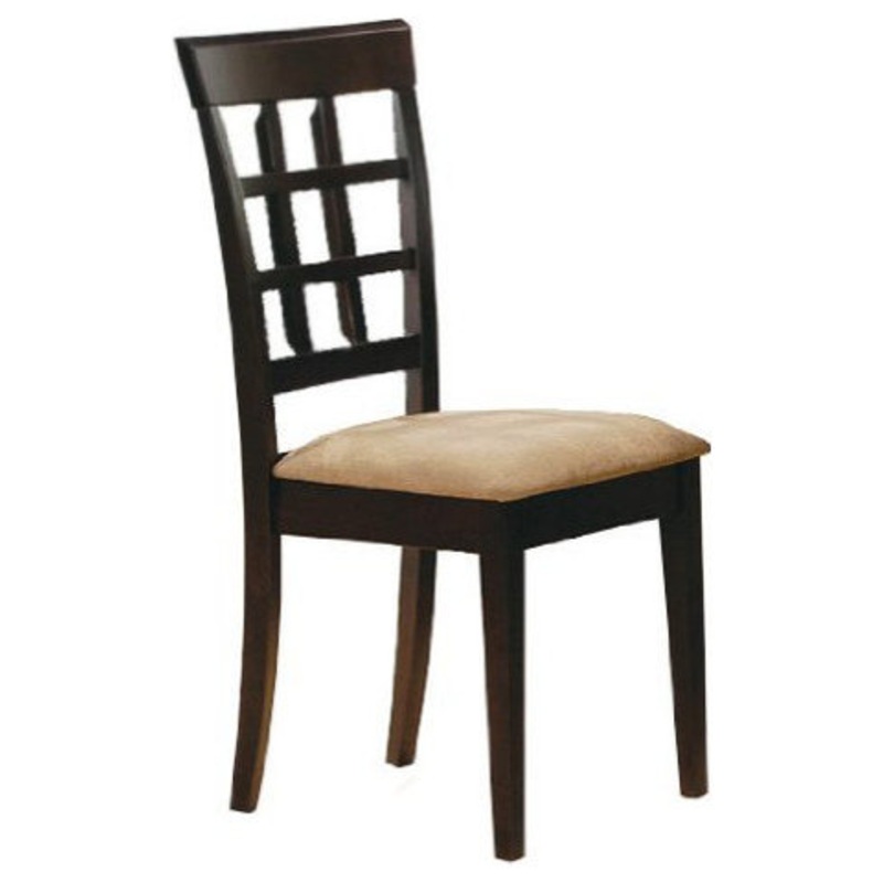 This lovely dining side chair will be a great addition to your casual contemporary dining ensemble. The chair has a high back with an open grid pattern for a distinctive style, above sleek square tapered legs. A padded seat covered in soft deep mocha colored microfiber adds to the comfort and durability of this chair. Pair with a table from this collection for a stylish look that fits your space. Assembly Required! Price is for 2 chairs. Dimensions: Width: 18″ x Depth: 22″ x Height: 39″