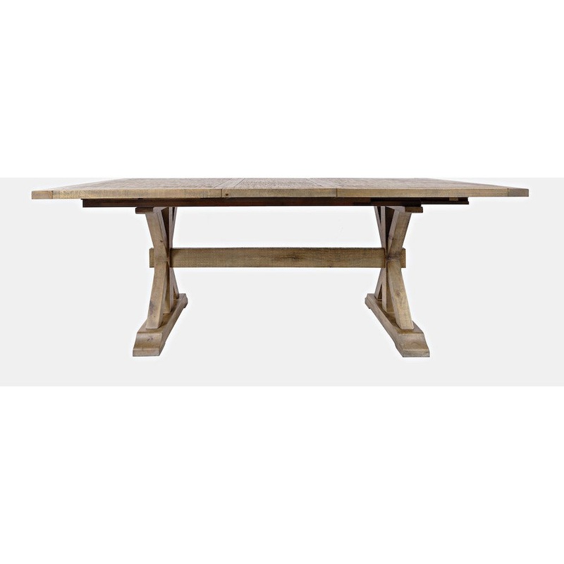 Rustic solid pine on a farmhouse pedestal and trestle base creates the perfect blend of classic and modern style with the Carlyle Crossing Extension Dining Table. The base with cross-beam supports are naturally distressed with plenty of character, and a ta