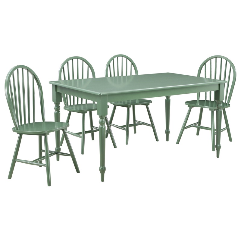 Bring some personality to your dining room with the 5-Piece Carolina Dining Set. This cozy set includes the Carolina Dining Table and four matching Carolina Dining Chairs, seating a family of four with plenty of space to spread your elbows. Every piece is crafted from rubberwood and then finished in bold Equestrian Green. The tables elegant turned legs and the chairs rounded spindle backs fill your dining room or breakfast room with plenty of farmhouse-inspired charm. Complete your picture-perfect home with the Carolina Dining Bench and Carolina Kitchen Cart both sold separately.