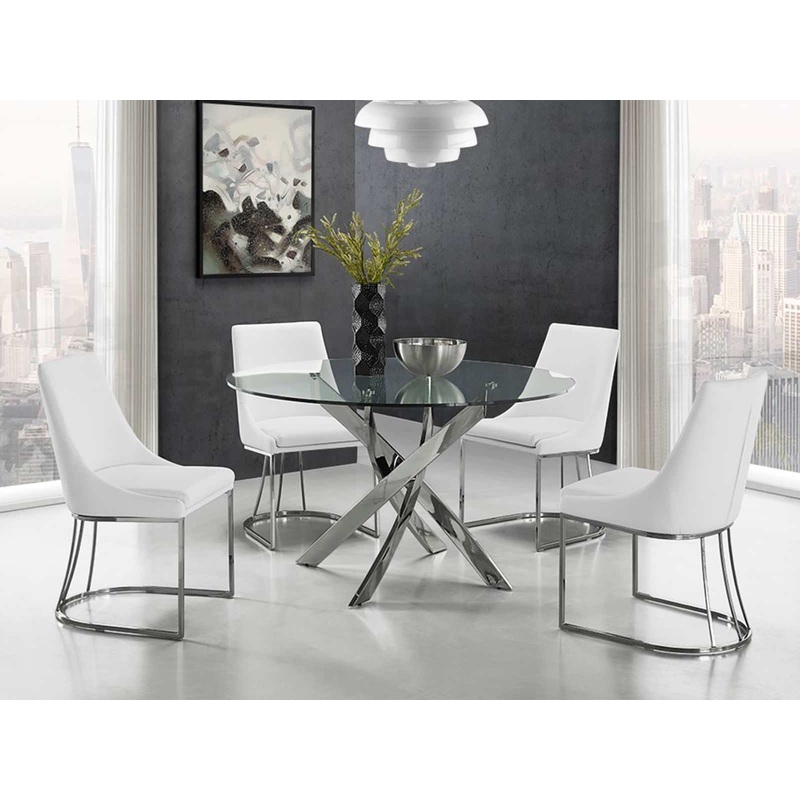 This chrome and clear glass dining table by Casabianca Home is part of the Galaxy collection. The clean, modern lines add a sophisticated look that easily complements any home design and adds a modern edge to any room. Made from chrome metal and glass, the