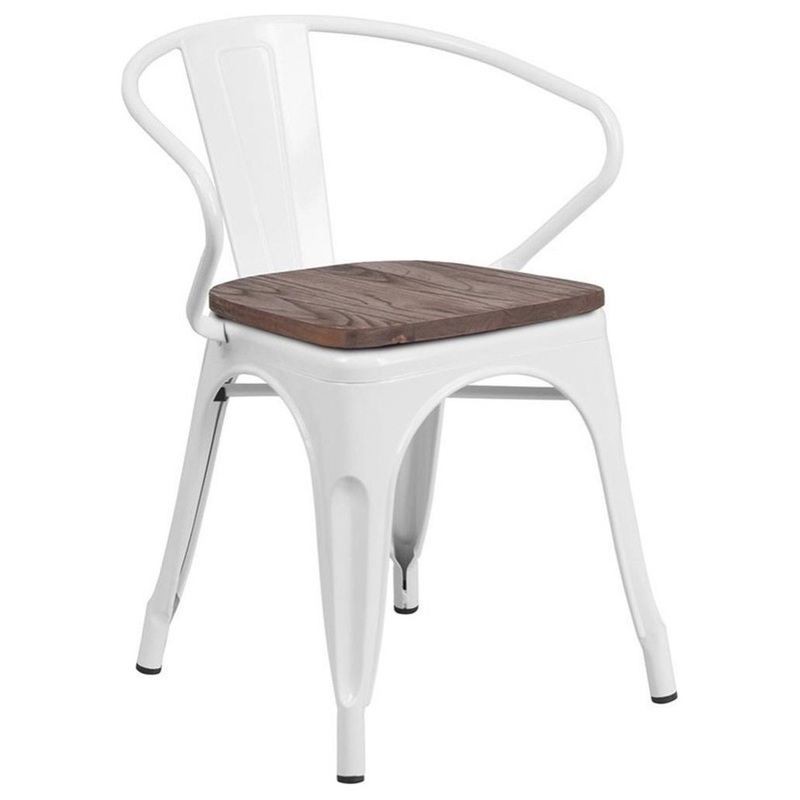 This rustic-chic, bistro stack chair will transform your dining room or restaurant space. Curved integrated arms allow you to rest easy. The chair is lightweight and easily stacks for storing. A cross brace underneath the seat adds extra stability and features plastic caps that prevent the finish from scratching when stacked. Move chairs around easily without scratching your floors with the protective floor glides. Designed for both commercial and residential use, you can liven up your kitchen, dining room or bistro with this modern-rustic style chair.