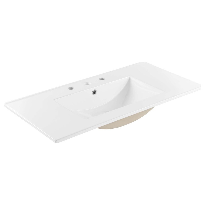 Wash, rinse, and brush in modern style with the Cayman Sink. Complete your bathroom vanity with this ceramic sink featuring an 8-inch centerset, integrated countertop, and squared basin design. Bullet Features: -Modern Bathroom Sink -Ceramic Construction -