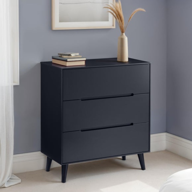 Retro inspiredMatt finishOak legsThis chest combines retro-inspired style with practical storage. Featuring three large drawers in a matt anthracite lacquered finish, it offers ample space for your clothing and accessories. The tapered oak finish legs and