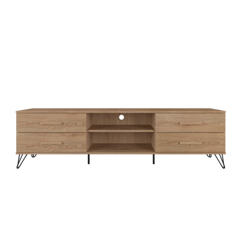 Material: Particle Board with 3D PU PaperWooden Leg Frame with Metal Leg SupportExtra Metal SupportExtraordinary WoodgrainTV Cabinet with 4 Drawers, 2 Open Storage ShelfHigh Legroom Easy For Household Work And CleaningSize: L180cm x W40cm x H49.4 cmDeliver