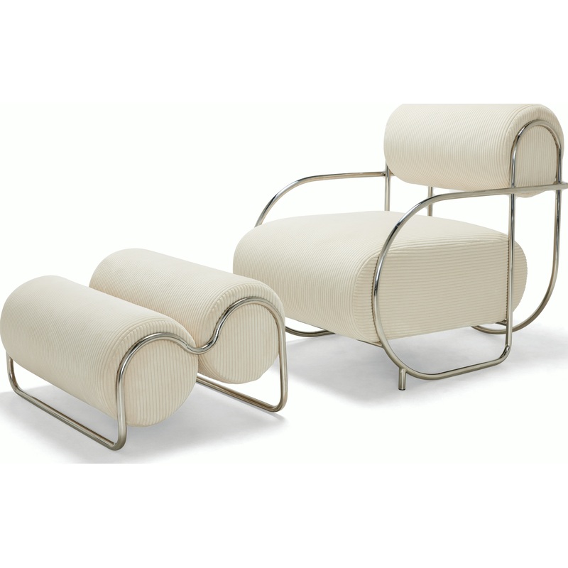 A DWR exclusive, the Chromeo Chair and Ottoman (2022) is Australian designer Sarah Ellisons first foray into working with metal. Pairing curved chromed tubing and oversized, comfortable bolster cushions, Chromeo is a study in contrasts. Sleek and contempor