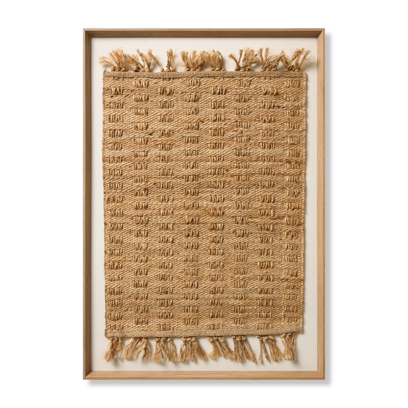 Churni large wall art by Loloi features a fringed jute textile with a raised gridded design, a strikingly textural piece for many home decor styles, from organic to farmhouse. The artwork is made in India and custom framed by Loloi in the USA, measuring 48 x 34.
