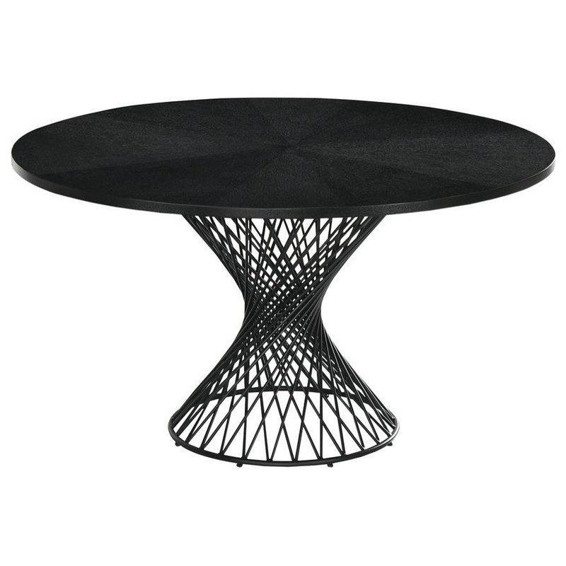 The 54 round Armen Living Cirque dining table features an intricate metal pedestal base. The unique style lends itself to a mid-century modern design theme, but it serves as a universal piece that can easily be paired with any style dining chairs. This tab
