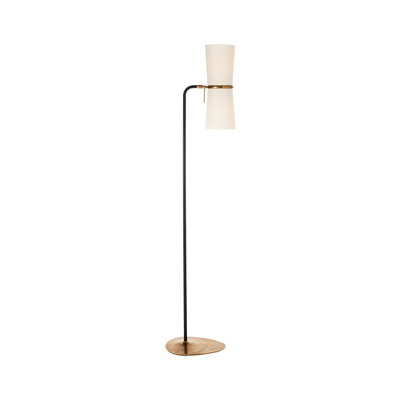 The Clarkson Floor Lamp by AERIN for Visual Comfort brings sculptural elegance to interiors through thoughtful proportion and material balance. Its tall, arched stem is grounded by an elliptical base and capped with a double-cone glass shade, offering ambient glow with architectural presence. This piece adds visual height and refined detail to reading corners, bedrooms, or open living spaces.