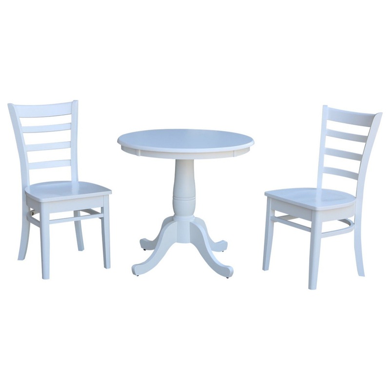 -Made from solid hardwood -Butcher block top -Distance from top to bottom of apron is 2.5" -Pedestal base features four feet for maximum support -Ladder back style chairs -Chairs feature box seat construction -Ready to assembleProduct ID197894574Manufactur
