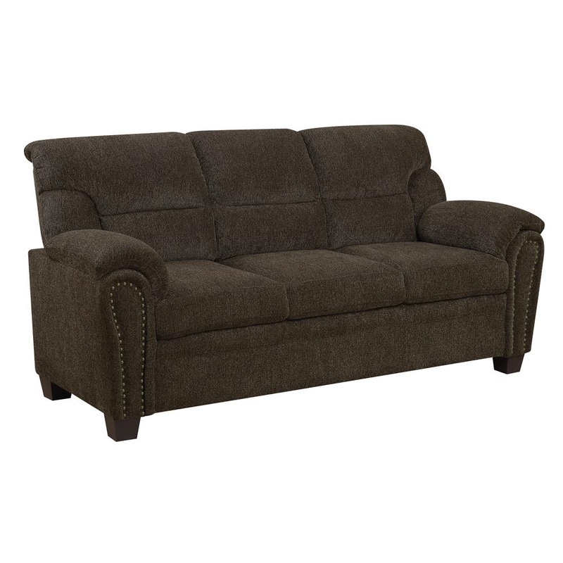 Add an aesthetic of cool, classic glamour to your living room. This sofa boasts a transitional design that looks lovely in any space. Its silhouette is sleek and simple with gracefully curved arms. Its beautiful upholstery is brought to life by elegant nailhead trim. Its seating is pleasingly soft and plush, rounding out its casual design with a high level of comfort.