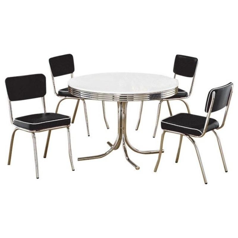 -Retro chrome plated tables display distinctive styling -Tables features a white finish and chrome rimmed top -Round shaped tables -Chrome plated chairs available in red or black leatherette -Round Retro Table 42.00" Dia x 30.00" H -Side Chair 17.00" W x 2